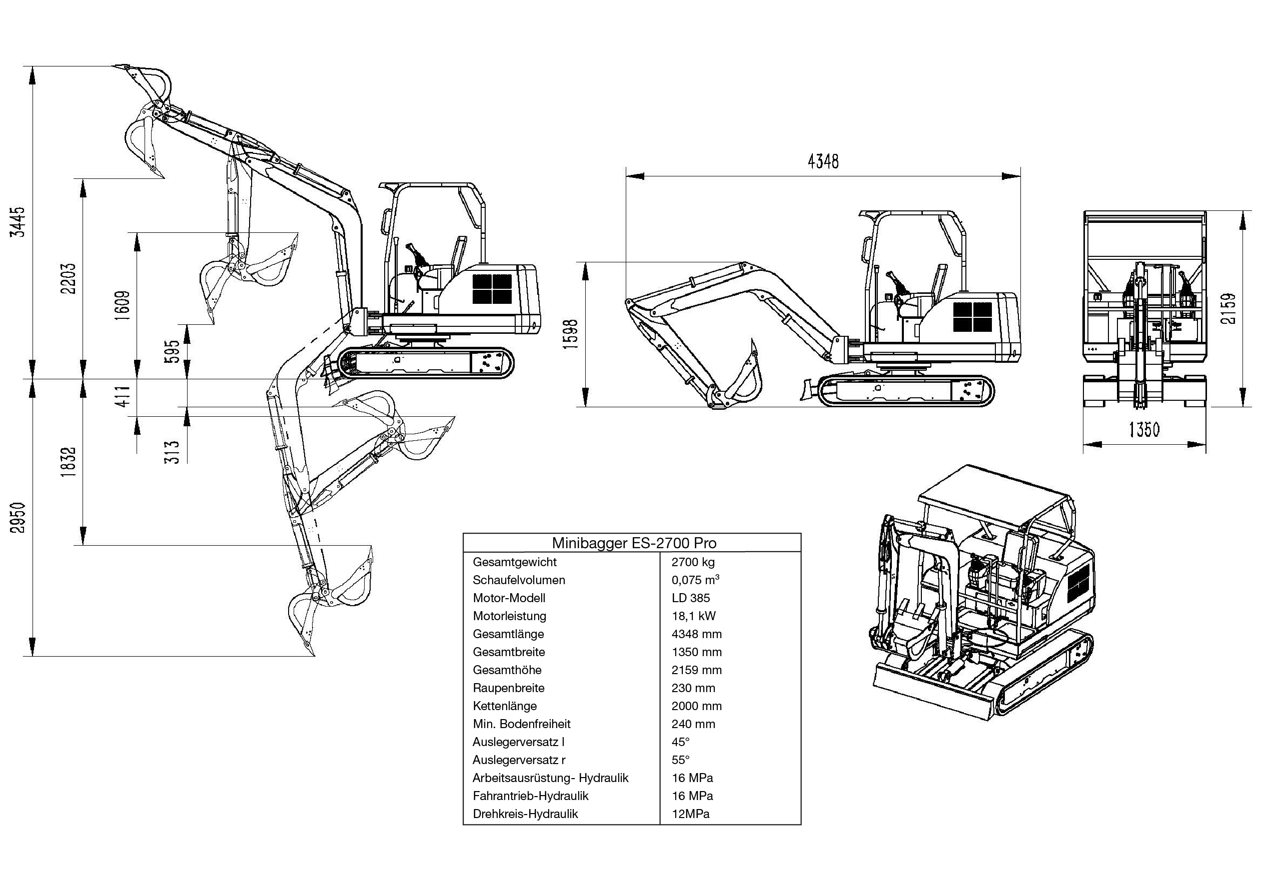 Der LÖWE ES-2700 Pro Minibagger ist ein leistungsstarker und vielseitiger Kompaktbagger, der speziell für professionelle Bauprojekte, Garten- und Landschaftsbau sowie kommunale Einsätze entwickelt wurde. Mit einer Leistungsklasse von 2700 kg, einem effizienten Dieselmotor nach Euro-5-Norm und einer Motorleistung von rund 25 PS bietet er die perfekte Kombination aus Kraft, Effizienz und präziser Steuerung. Dank einer beeindruckenden Grabtiefe von bis zu 2418 mm und einer maximalen Reichweite von 3887 mm eignet sich der ES-2700 Pro ideal für anspruchsvolle Erdbewegungen und Arbeiten in beengten Einsatzbereichen.